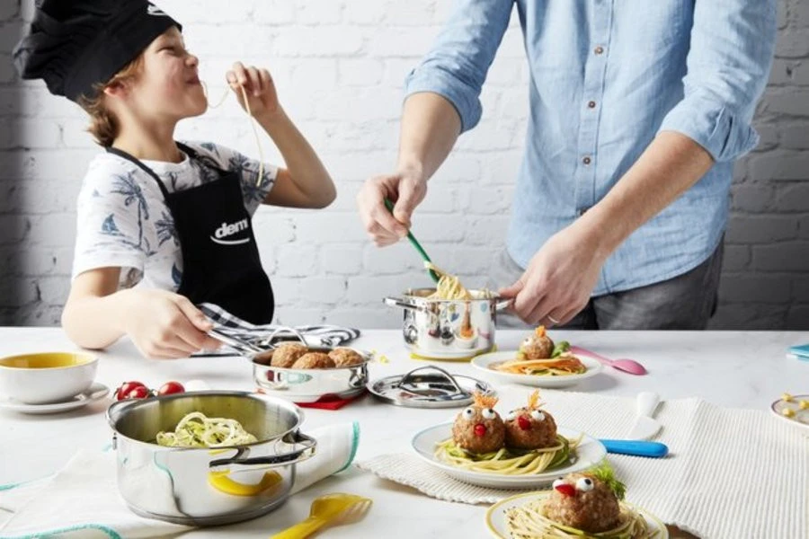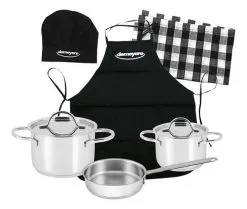 Jong geleerd is handig voor later. Deze Resto 3 set met mini-kookgerei ontwikkelden we speciaal voor kinderen. Geen speelgoed, wel heel leuk. Onder veilige begeleiding van mama, papa, oma of opa kan er naar hartenlust gekookt en gebakken worden: Tomatensoep met balletjes, slurpspaghetti, goudgele pannenkoekjes, …. Applaus voor jezelf! En voor het schattige kookpotje, soeppotje en bakpannetje van 12 cm doorsnede. Geschikt voor alle kookplaten, ook inductie. Om de pret en deze set helemaal compleet te maken, hebben we ook aan toffe accessoires gedacht: een schort en koksmuts in de maat extra small en een keukenhanddoek. Dat wordt genieten met die kleine chef!