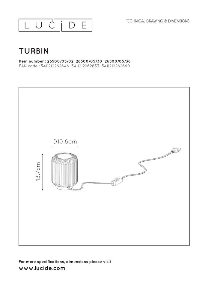 Met de sierlijkheid van een ronddraaiende prinses in haar beste baljurk golven de aluminium lamellen zich rond de geïntegreerde ledverlichting van Turbin. De schattige tafellamp is een moderne cilinder van amper meer dan 10 centimeter breed, lang en hoog. De geïntegreerde ledverlichting verspreidt het licht rondom, door de kieren van het aluminium omhulsel. Geheel in de lijn van zijn compact formaat, is de tafellamp makkelijk te installeren: je stopt enkel het snoer in het stopcontact en schakelt Turbin aan of uit met de knop op de lamp.