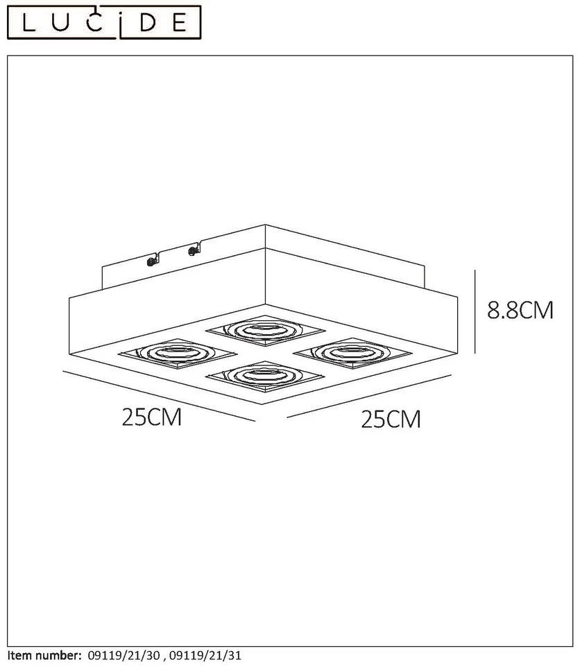 Dit verlichtingsvierkant van Lucide heeft een lichaam van 25 op 25 centimeter. Binnenin draagt deze Xirax-verlichting vier eigentijdse dim to warm GU10-fitting.
