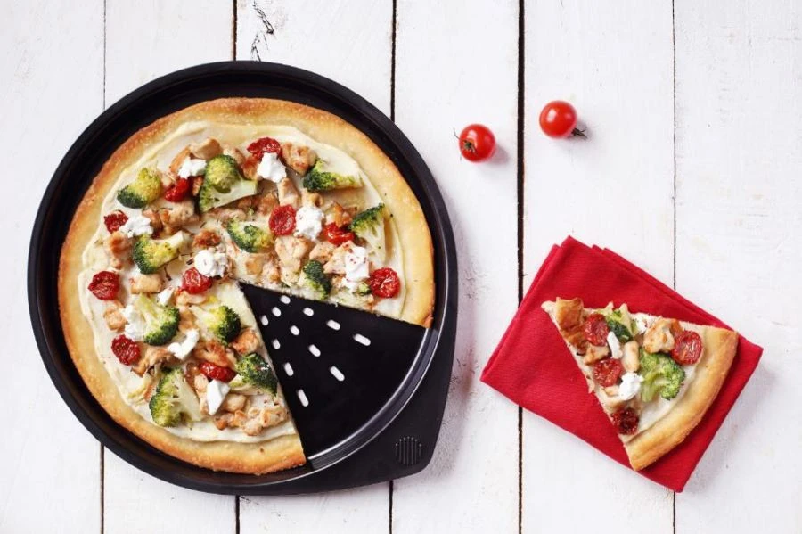 Hiermee kun je genieten van het maken van een perfect gebakken pizza. De bodem van deze pizzaplaat is voorzien van een non-stick coating, waardoor je de pizza makkelijk van de plaat kunt schuiven.