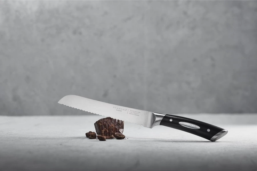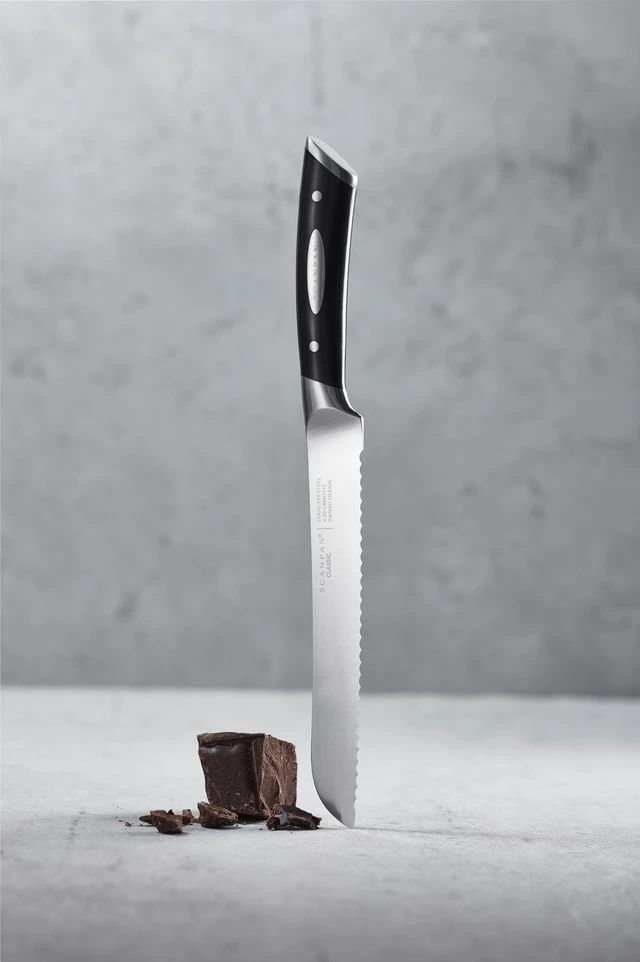 Scanpan broodmes met een lemmet lengte van 20cm. Het lemmet is voorzien van scherpe kartels waardoor het gemakkelijk door zowel zacht als hard brood snijdt. Ook is het broodmes perfect voor het snijden van groenten en fruit wat is voorzien van een harde buitenkant en zachte binnenkant. Messen uit de Scanpan Classic serie zijn voorzien van een lemmet gemaakt van hoogwaardig Duits staal. Het lemmet heeft een hardheid van 56-57 HRC. De messen zijn voorzien van een elegante vorm. De messen zijn perfect voor het dagelijks gebruik en hebben een perfecte gewichtsverdeling. Dankzij de ergonomisch gevormde handgrepen liggen de messen comfortabel in de hand en heb je extra grip. Ook na uren gebruiken zul je geen last krijgen van je handen.