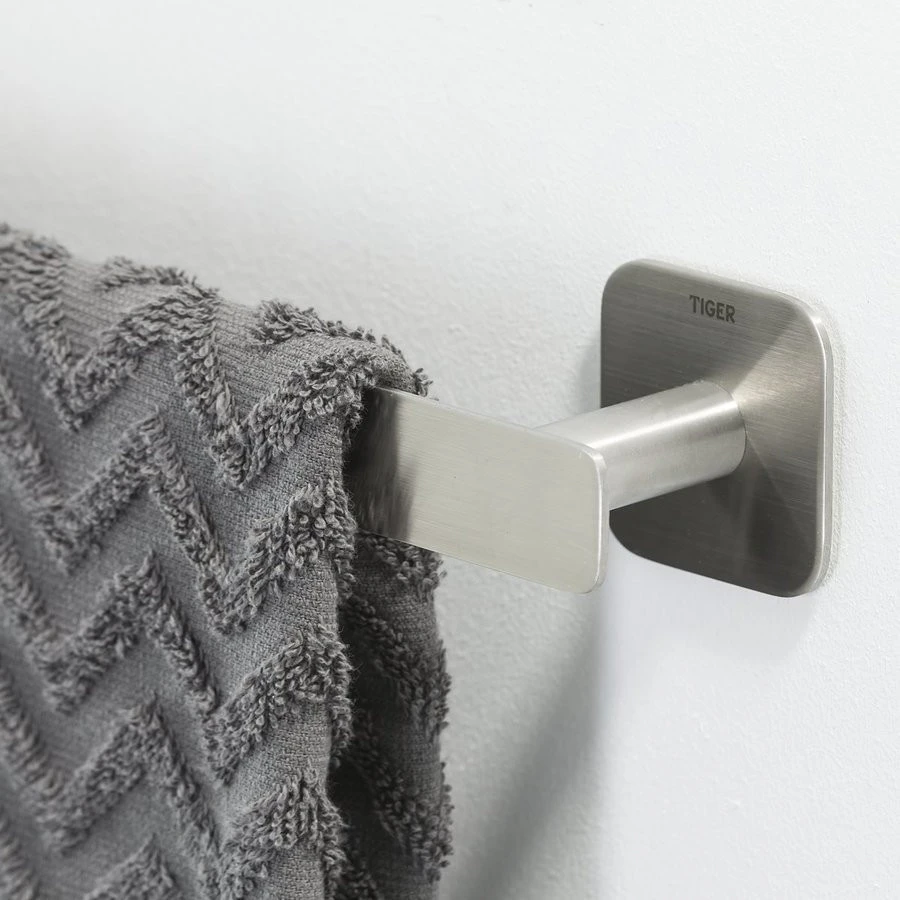 Het badhanddoekrek uit de Colar serie van Tiger is uitgevoerd in geborsteld RVS. De handdoekhouder is voorzien van een krachtige dubbelzijdige tape waardoor montage op iedere gladde, stevige ondergrond zeer eenvoudig is. De Colar serie bevat tevens een groot aantal aanvullende accessoires voor de badkamer en toiletruimte in dezelfde stijl.