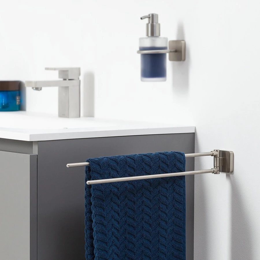 Het 2-armige handdoekrek uit de Tiger Onu serie is uitgevoerd in de kleur RVS geborsteld en biedt plaats aan twee handdoeken. Door de beweegbare armen is het eenvoudig de handdoeken te laten drogen. Daarnaast zorgt dit rek voor een optimale invulling van de ruimte rondom de wastafel. Het 2-armige handdoekrek is eenvoudig aan de wand te bevestigen waarbij de bijgeleverde bevestigingsmaterialen uit het zicht verdwijnen. Naast dit handdoekrek bevat de Onu serie een groot aantal aanvullende artikelen voor de badkamer en het toilet.